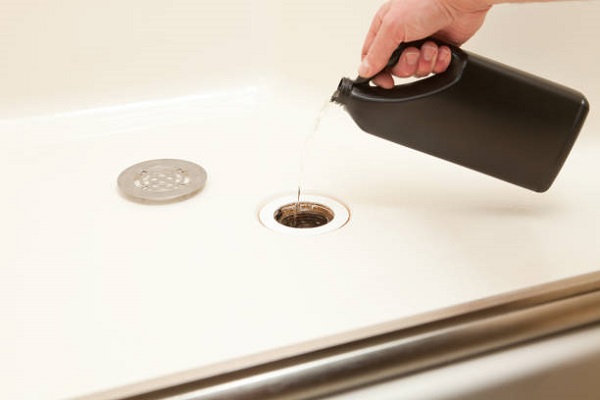 - Побутова хімія. Є покупні засоби на основі лугу чи кислот. Перший варіант ефективний проти органічних засмічень, а другий – добре розщеплює вапняний наліт, затверділі та мінеральні відкладення. Препарат додають у сухий зливний отвір (важливо, щоб не було стоячої води), витримують час, вказаний в інструкції та промивають великою кількістю води. Дотримуйтесь техніки безпеки: надягайте щільні гумові рукавички при використанні хімікатів та провітрюйте приміщення після процедури.